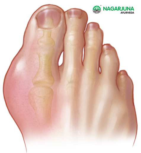 Ayurveda consider this as a type of vataraktha (Pitha pradhana). Acute stage is managed usually with medicated paste application (lepa), pouring of lukewarm herbal decoction (dhara) and purgation (virechana). Appropriate internal medicines are also given to reduce the inflammation. Drinking of water boiled with herbs with diuretic property will flush out the excess uric acid from the body. Chronic cases are treated with internal medications and external therapies flush the extra uric acid from the body and will also help correct the purine metabolism. So the treatments will prevent relapses and complications like formation of kidney stones.